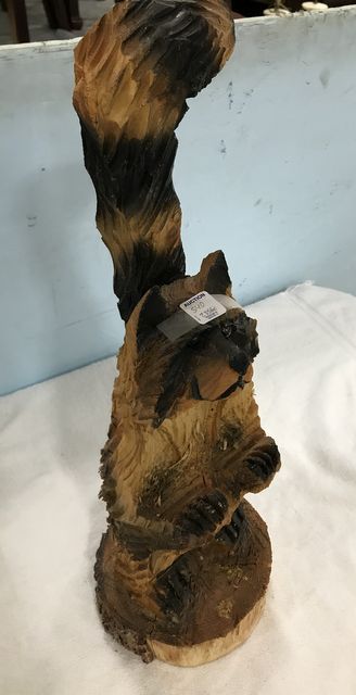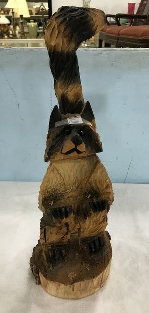 Chainsaw Carving Raccoon Statue, out of log, with painted designs, 23"h. Chainsaw Carving Raccoon Statue, out of log, with painted designs, 23"h.