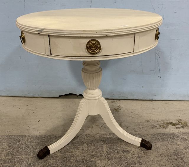 Duncan Phyfe Painted White Drum Table, pedestal with brass claw feet, single drawer, base needs some tightening, 28"h., 27"w. Duncan Phyfe Painted White Drum Table, pedestal with brass claw feet, single drawer, base needs some tightening, 28"h., 27"w.