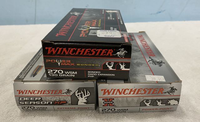 Winchester Super X 270 WSM, 150 grain, Power max 270 WSM, 130 grain, 60 cartridges. Winchester Super X 270 WSM, 150 grain, Power max 270 WSM, 130 grain, 60 cartridges.