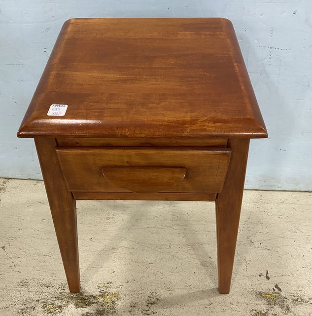 Primitive style side table, single drawer, reproduction, tampered legs, good condition, 24"h., 14"w. Primitive style side table, single drawer, reproduction, tampered legs, good condition, 24"h., 14"w.