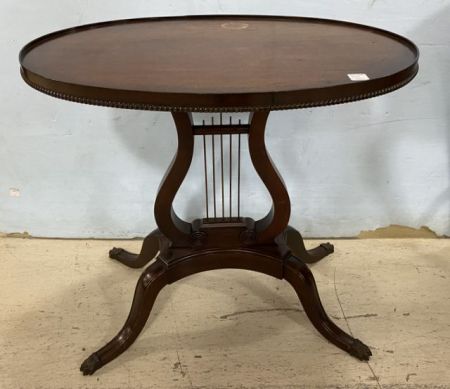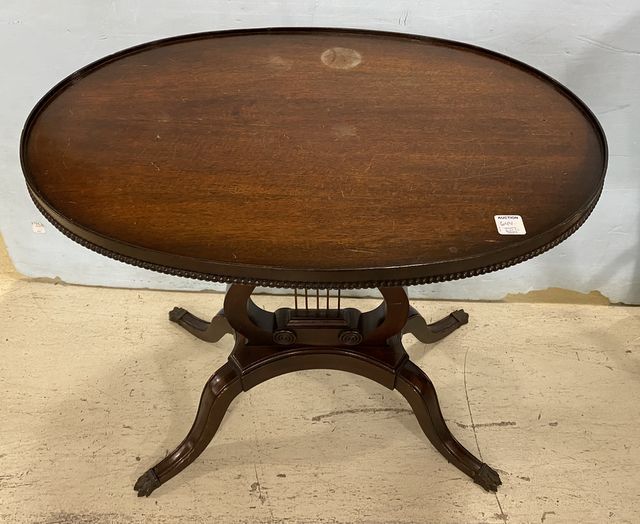 Duncan Phyfe Oval Pedestal Table, mahogany, Lyre pedestal base with brass claw feet, has scratches, 24"h., 25"w. Duncan Phyfe Oval Pedestal Table, mahogany, Lyre pedestal base with brass claw feet, has scratches, 24"h., 25"w.