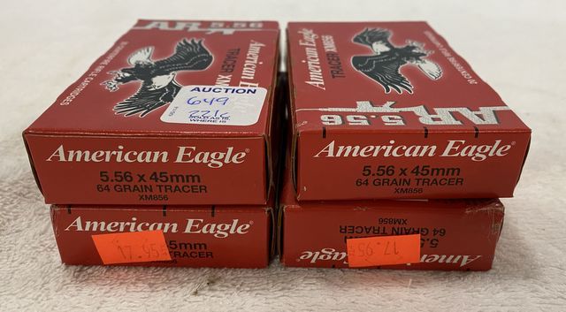 American Eagle 5.56 x 45mm 65 Grain Tracer, 4 boxes, 80 cartridges. American Eagle 5.56 x 45mm 65 Grain Tracer, 4 boxes, 80 cartridges.