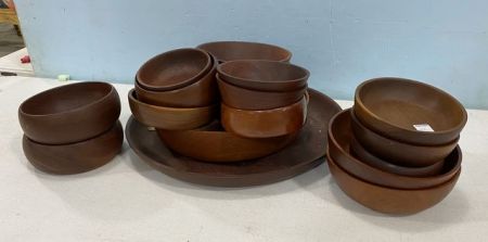 Collection of Wood Dinner Ware, bowls, serving bowl, and oval platter. Collection of Wood Dinner Ware, bowls, serving bowl, and oval platter.
