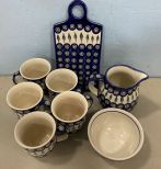 Boleslawiec Poland Ceramic Pottery, trivet, 5 mugs, pitcher, bowl, good condition. Boleslawiec Poland Ceramic Pottery, trivet, 5 mugs, pitcher, bowl, good condition.