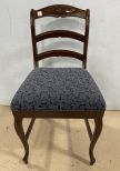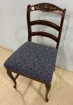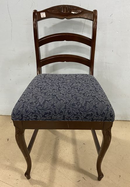 French Mahogany Side Chair, carved flower crest, floral pattern seat, has finish wear, 33"h. French Mahogany Side Chair, carved flower crest, floral pattern seat, has finish wear, 33"h.