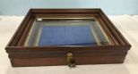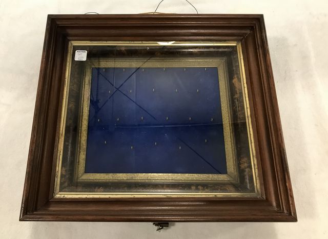Wall Hanging Shadow Box Display, wood framed, blue felt with hanging hooks, has latch and key, 16"h., 18"w. Wall Hanging Shadow Box Display, wood framed, blue felt with hanging hooks, has latch and key, 16"h., 18"w.