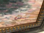 Oil Painting Landscape of Lady on Bridge by Badall, on canvas, framed, 31"h., 27"w. Oil Painting Landscape of Lady on Bridge by Badall, on canvas, framed, 31"h., 27"w.