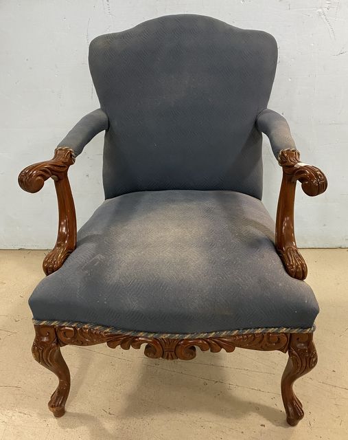 French Style arm chair, cherry, antique reproduction, carved designs, upholstery is dirty, 36"h. French Style arm chair, cherry, antique reproduction, carved designs, upholstery is dirty, 36"h.