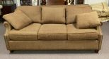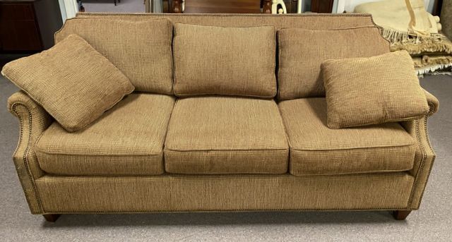 Three Cushion Upholstered Sofa, modern sofa, brown, two throw pillows, back legs are loose, 7", fabric is clean. Three Cushion Upholstered Sofa, modern sofa, brown, two throw pillows, back legs are loose, 7", fabric is clean.