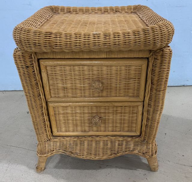 Natural color wicker night stand, two drawer, back leg is unwrapped, 20"h., 22"w. Natural color wicker night stand, two drawer, back leg is unwrapped, 20"h., 22"w.