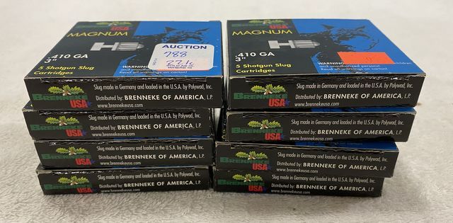 Brenneke .410 Silver Slugs, 3" magnum, 8 boxes, 40 shells. Brenneke .410 Silver Slugs, 3" magnum, 8 boxes, 40 shells.