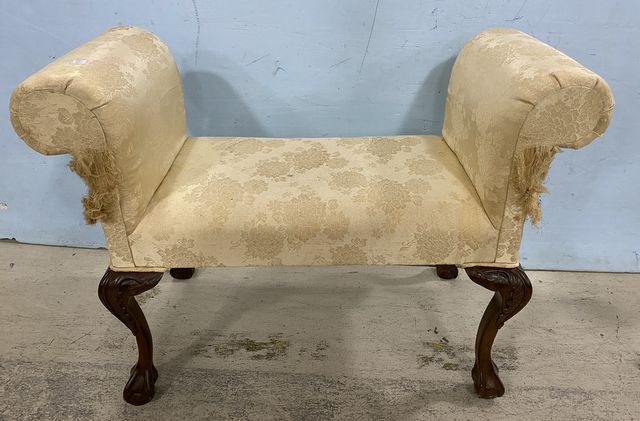 Upholstered Ball-n-Claw Window Bench, cherry base, scroll arms, needs new upholstery, 30"h., 42"w. Upholstered Ball-n-Claw Window Bench, cherry base, scroll arms, needs new upholstery, 30"h., 42"w.