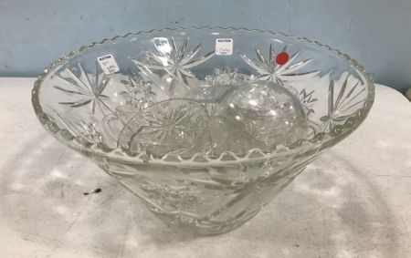 Pressed Glass Punch Bowl with Cups, plastic ladle, 7"h., 14"dia. Pressed Glass Punch Bowl with Cups, plastic ladle, 7"h., 14"dia.
