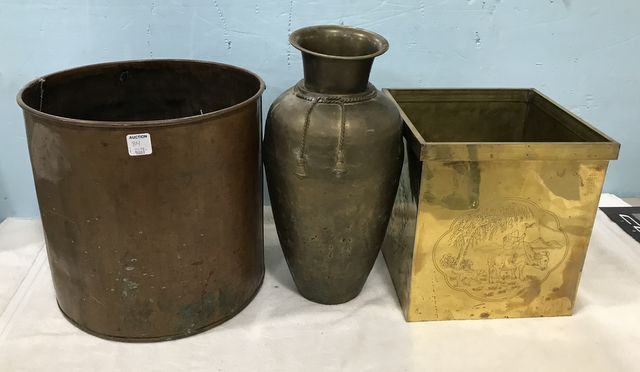 814 Vintage Copper Bucket, Brass Urn, and Brass Planter Container
