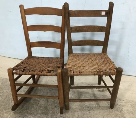 Two Primitive Hand Made Chair and Rocker, slat back, woven seats (have damage), 32"h. Two Primitive Hand Made Chair and Rocker, slat back, woven seats (have damage), 32"h.