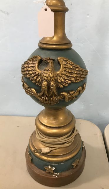 Vintage plaster lamp, hand painted with eagle emblem, has chips, no shade, 28"h. Vintage plaster lamp, hand painted with eagle emblem, has chips, no shade, 28"h.
