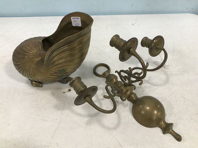 Vintage Brass Footed Shell and Brass Candle Sconce. Vintage Brass Footed Shell and Brass Candle Sconce.
