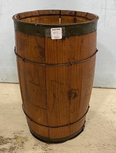 Vintage Wood Barrel, metal bands, good condition, 17"h., 10"dia. Vintage Wood Barrel, metal bands, good condition, 17"h., 10"dia.