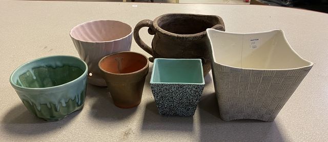 6 Vintage Pottery Flower Pots, Brush McCoy, Kenwood, Shawnee, and USA, plus two modern plower pots. 6 Vintage Pottery Flower Pots, Brush McCoy, Kenwood, Shawnee, and USA, plus two modern plower pots.