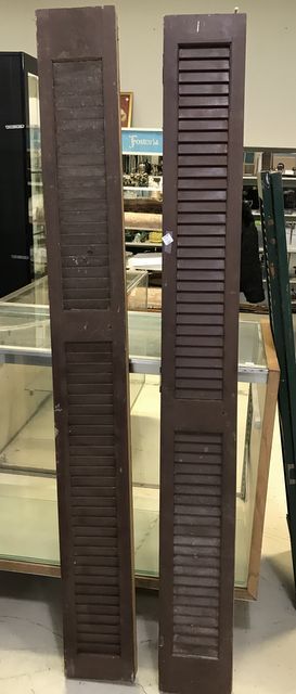 Two Pair of Hinged Shutter Style Doors, painted green, 78 1/2"h., 9"d each panel. Two Pair of Hinged Shutter Style Doors, painted green, 78 1/2"h., 9"d each panel.
