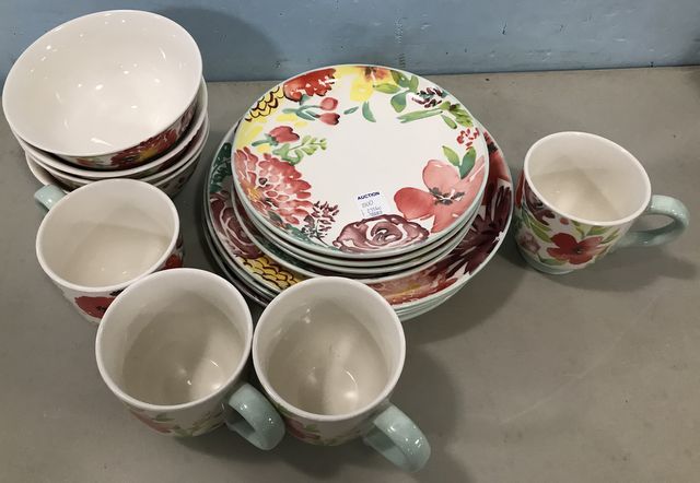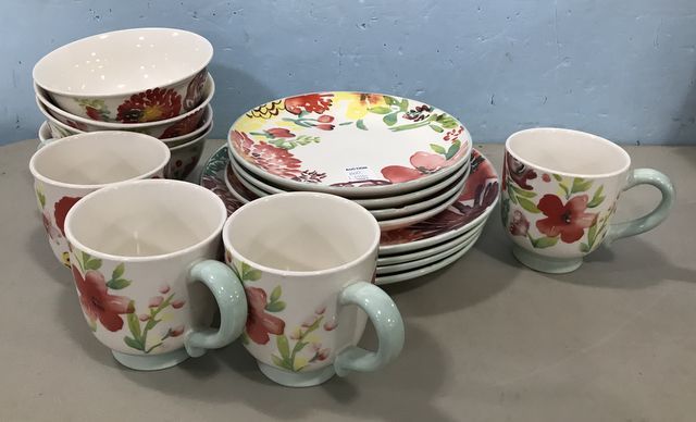 Threshold Corinna Stoneware Pottery, floral designs, 4 dinner plates, 4 salad plates, four bowls, 4 mugs. Threshold Corinna Stoneware Pottery, floral designs, 4 dinner plates, 4 salad plates, four bowls, 4 mugs.