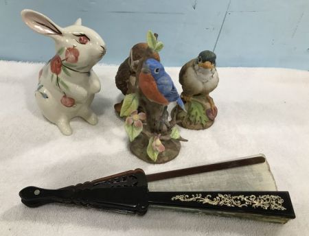 1052 Three Andrea Bird Ceramic Figurines, Decorative Fan, and Gail Pittman Rabbit