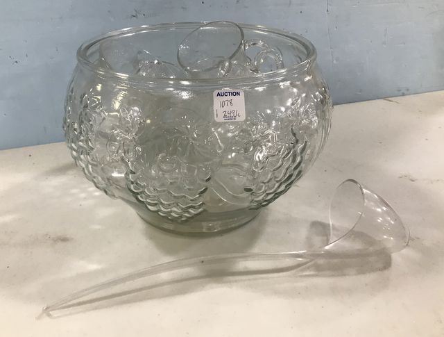 Grape Pattern Glass Punch Bowl, 7"h., 9 1/2"dia. and Cups, did not match, has plastic ladle. Grape Pattern Glass Punch Bowl, 7"h., 9 1/2"dia. and Cups, did not match, has plastic ladle.
