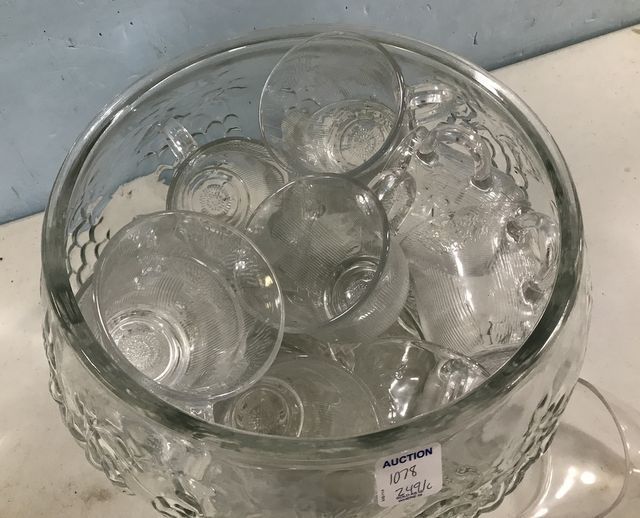 1078 Grape Pattern Glass Punch Bowl and Cups