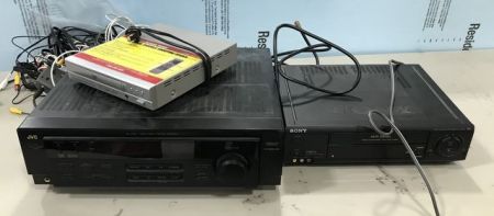 JVC Receiver, Sony VHS Player, Coby Dvd, and Speaker JVC Receiver, Sony VHS Player, Coby Dvd, and Speaker