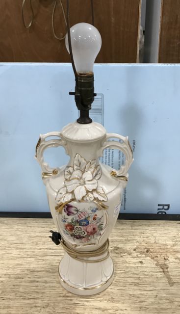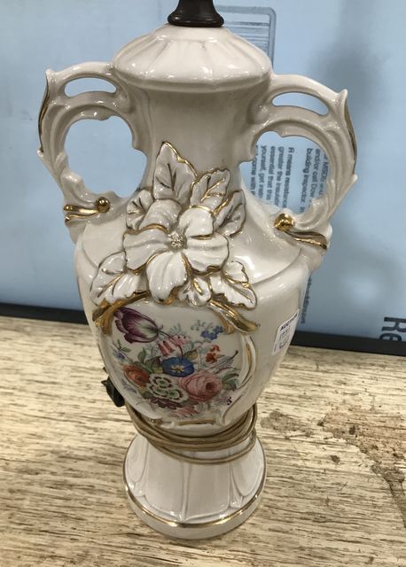 Hand Painted Porcelain Vase Lamp, floral designs, handled, with gold gilt trim, no shade, 28"h. Hand Painted Porcelain Vase Lamp, floral designs, handled, with gold gilt trim, no shade, 28"h.