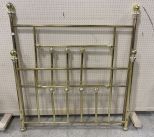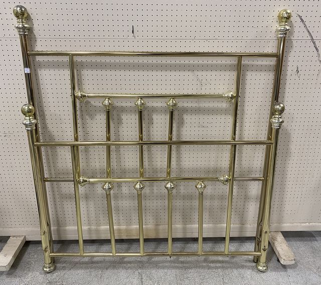 Full size brass bed, no rail, takes regular bolt in metal frames, headboard missing spindle. Full size brass bed, no rail, takes regular bolt in metal frames, headboard missing spindle.