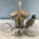 Group of porcelain decor, Basket, deer, cat, covered butters, and mini tea pot. Group of porcelain decor, Basket, deer, cat, covered butters, and mini tea pot.