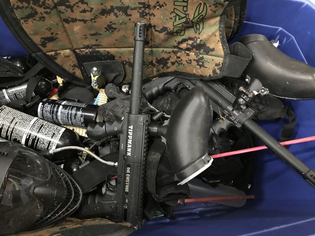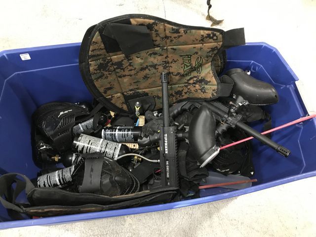 Box lot of paintball gear, many CO2 refill bottles, vests, masks, loaders, two guns. Box lot of paintball gear, many CO2 refill bottles, vests, masks, loaders, two guns.