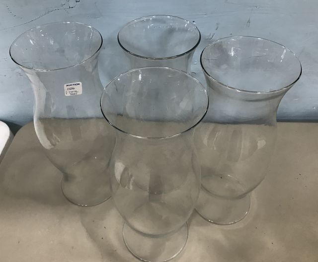 Four Clear glass hurricane shades, 14"h. Four Clear glass hurricane shades, 14"h.