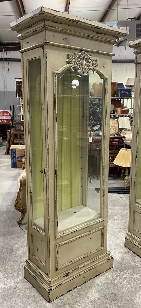 Painted Tall Curio Display Cabinet, distressed painted, has wood and glass shelves, lighted, good condition, has key, 81"h., 29"w., 16"d. Location 5th Row Painted Tall Curio Display Cabinet, distressed painted, has wood and glass shelves, lighted, good condition, has key, 81"h., 29"w., 16"d. Location 5th Row