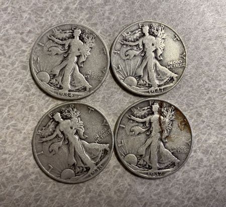 Four 1930's Walking Liberty Half Dollars, 1934, 1947, 1937, 1938. Good condition. Four 1930's Walking Liberty Half Dollars, 1934, 1947, 1937, 1938. Good condition.