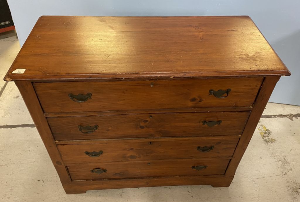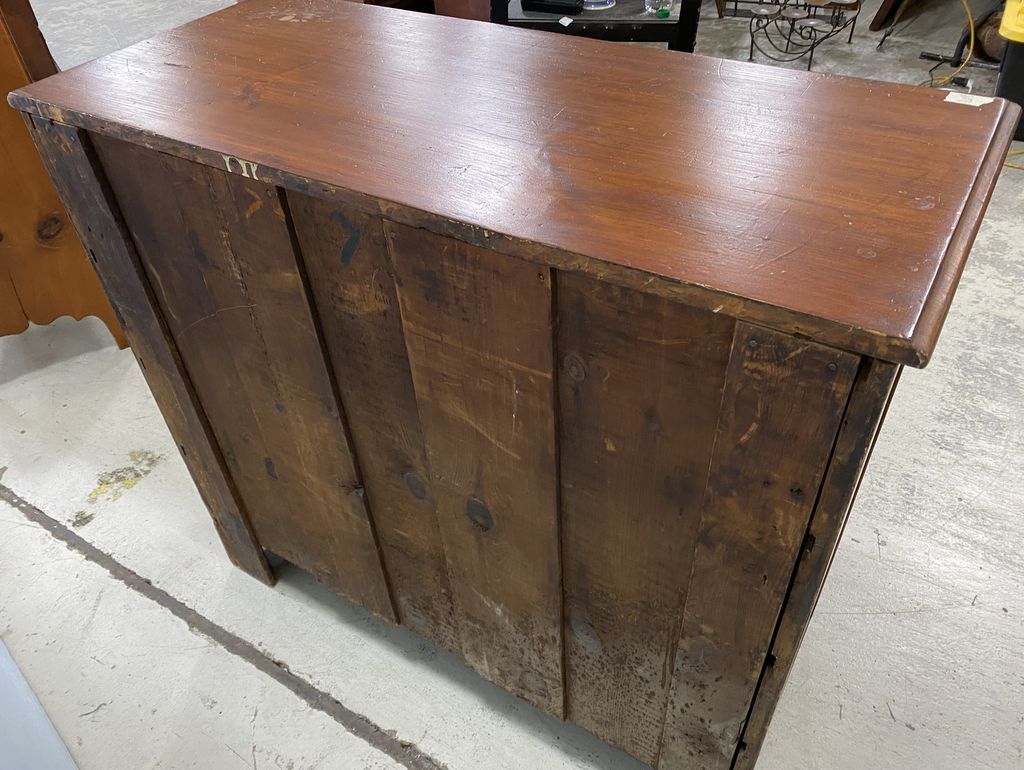 1800's Early American Chest of Drawers, four drawers, age wear on finish, 35"h., 39"w., 17"d. Location 2nd Row. 1800's Early American Chest of Drawers, four drawers, age wear on finish, 35"h., 39"w., 17"d. Location 2nd Row.
