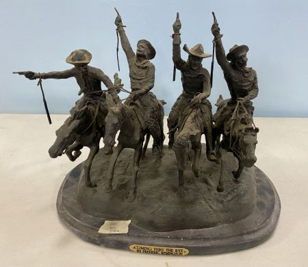 Frederic Remington "Coming Thru The Rye" Statue, come 1970's, needs cleaning, good condition, 16"w., 13"h. Location Right Metal Shelves. Frederic Remington "Coming Thru The Rye" Statue, come 1970's, needs cleaning, good condition, 16"w., 13"h. Location Right Metal Shelves.