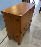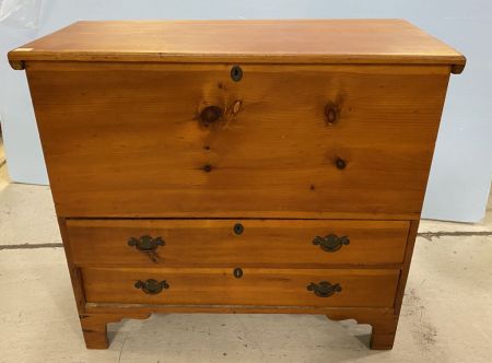 Antique Primitive Pine Blanket Chest, lift top chest, two drawers, footed, some age wear, 38"h., 41"w., 18"d. Location 2nd Row. Antique Primitive Pine Blanket Chest, lift top chest, two drawers, footed, some age wear, 38"h., 41"w., 18"d. Location 2nd Row.