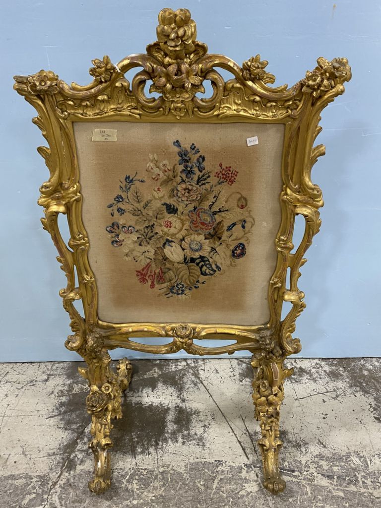 18th Century Water Gilded Fire Screen with Petite Point Embroidery, fragile, loose feet, has some chips, 45"h., 24"w. Location 5th Row 18th Century Water Gilded Fire Screen with Petite Point Embroidery, fragile, loose feet, has some chips, 45"h., 24"w. Location 5th Row