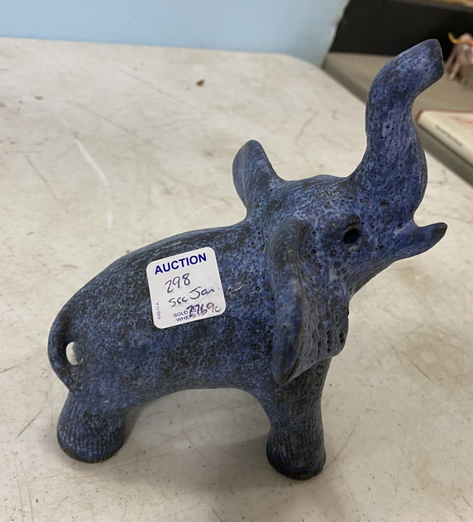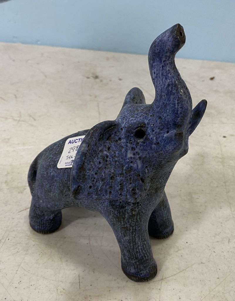 Peters Pottery Blue Elephant, 7"h. Location Front Left Glass Showcase. Peters Pottery Blue Elephant, 7"h. Location Front Left Glass Showcase.