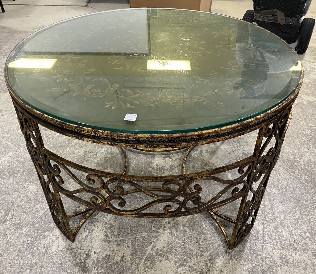 Italian Style Gold Leaf Painted Round Coffee Table, beveled glass top, metal base, 23"h., 36"dia. Location Left Office. Italian Style Gold Leaf Painted Round Coffee Table, beveled glass top, metal base, 23"h., 36"dia. Location Left Office.