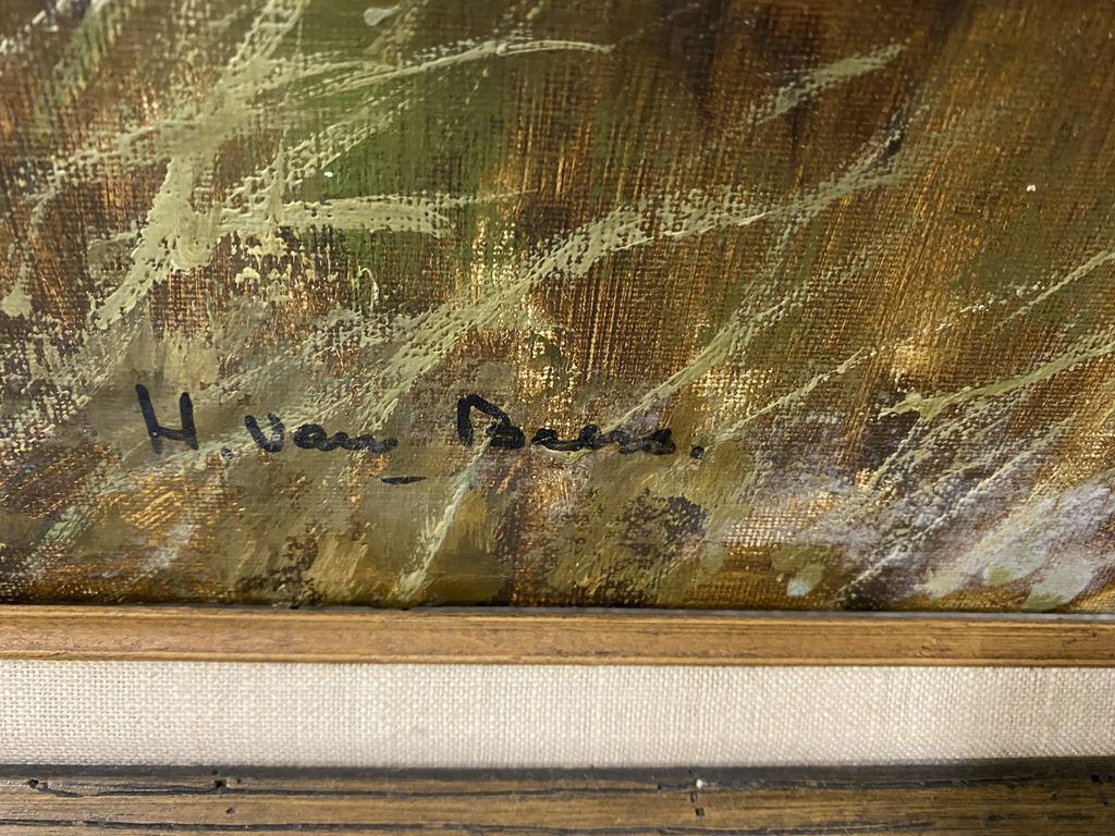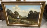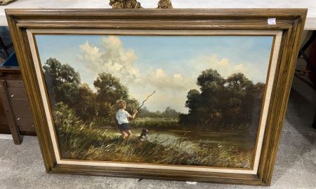 Embassy Art Gallery Van Beers Painting, boy fishing, signed lower right, on canvas, framed, 32"h., 43"w. Location Left Office. Embassy Art Gallery Van Beers Painting, boy fishing, signed lower right, on canvas, framed, 32"h., 43"w. Location Left Office.