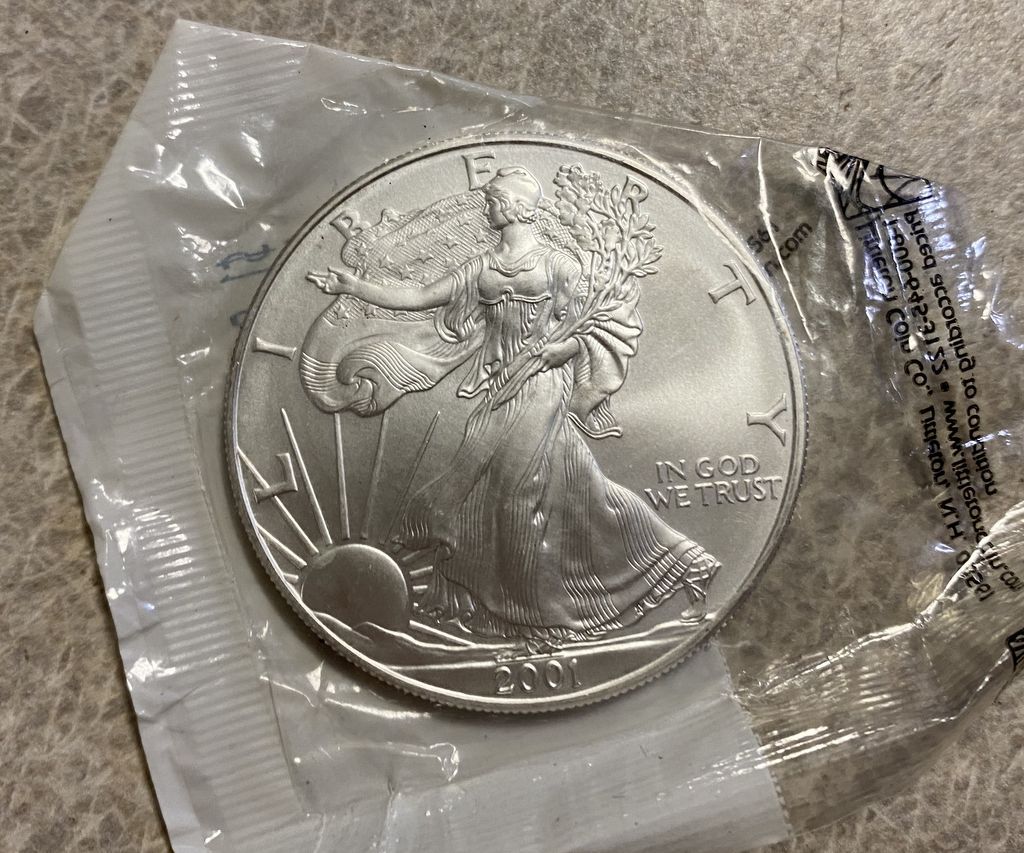 2001 American Eagle Silver Dollar, uncirculated, fine .999 silver, in plastic. 2001 American Eagle Silver Dollar, uncirculated, fine .999 silver, in plastic.