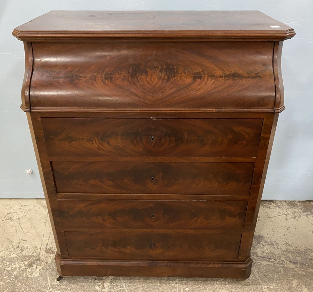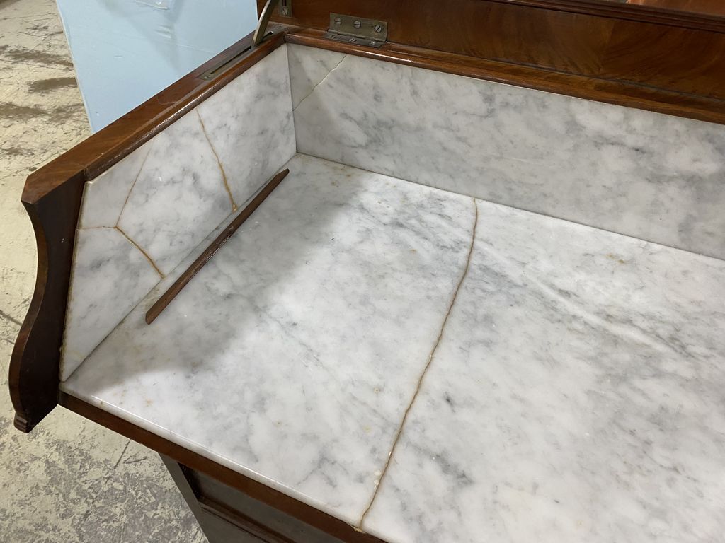Antique Empire Burl Mahogany Veneer Vanity Chests, lift top with mirror, marble is damaged, four drawers, 37"h., 31"w., 18"d. Location 4th Row Antique Empire Burl Mahogany Veneer Vanity Chests, lift top with mirror, marble is damaged, four drawers, 37"h., 31"w., 18"d. Location 4th Row