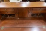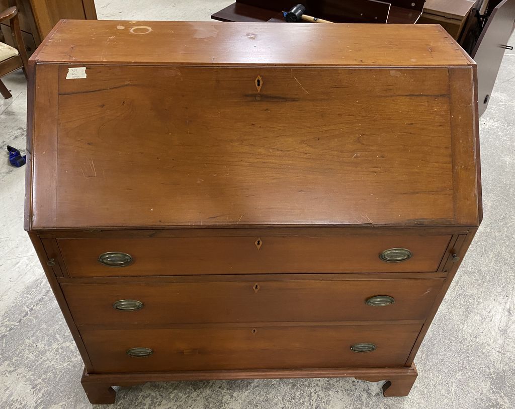 Antique Hepplewhite Style Secretary, drop front desk, three drawers, mahogany, no top, light scratches on finish, 42"h., 40"w., 20"d. Location 2nd Row. Antique Hepplewhite Style Secretary, drop front desk, three drawers, mahogany, no top, light scratches on finish, 42"h., 40"w., 20"d. Location 2nd Row.