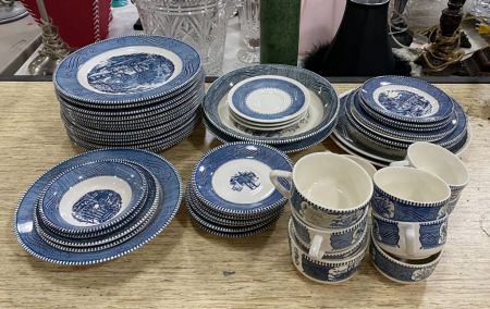 Currier & Ives Blue and White Pottery Set, bowls, plates cups, saucers. Location Back Metal Cases Currier & Ives Blue and White Pottery Set, bowls, plates cups, saucers. Location Back Metal Cases