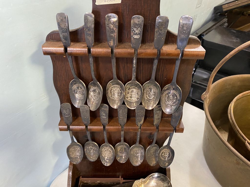 Collectible 13 Colonies Spoons, silver plate, with wood rack, 20"h. Collectible 13 Colonies Spoons, silver plate, with wood rack, 20"h.
