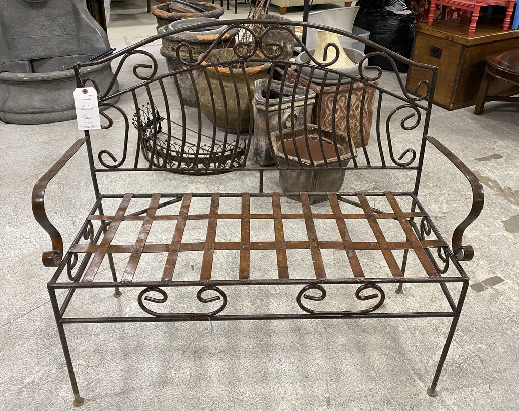 Wrought Iron Outdoor Bench, weathered condition, 41"w. Location 2nd Row. Wrought Iron Outdoor Bench, weathered condition, 41"w. Location 2nd Row.