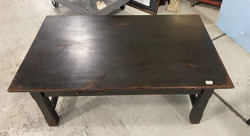 Habersham Plantation Black Coffee Table, single drawer, light wear, 20"h., 50"w., 30"d. Location 3rd Row. Habersham Plantation Black Coffee Table, single drawer, light wear, 20"h., 50"w., 30"d. Location 3rd Row.